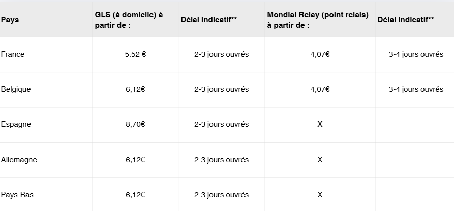 ** Délais donnés à titre indicatif, hors week-ends et jours fériés : ils peuvent varier selon le traitement de la commande et les contraintes transporteur.